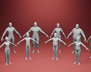 Stylized Human Body Base Mesh 3D Model Pack pack consists of 10 models: man + woman + boy + girl (standard, fat, & fit).