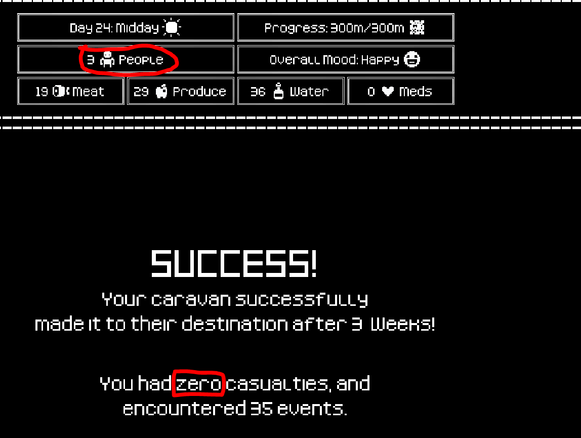 Cool game. I kept dying though, I wish there was a bit more strategy and agency. I did have some funny moments where I lost all my medicine day 2, and then it turns out I could still give medicine for free in events because there wasn't actually a check, with me ending the journey with about -20 medicine. (That probably didn't help me, though, I died at 280 meters.)