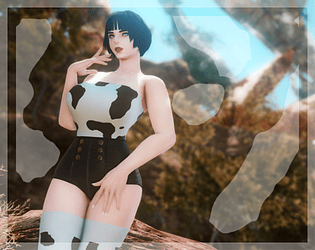High-waisted pinup sailor shorts and a pair of matching cow-print tube top and stockings.