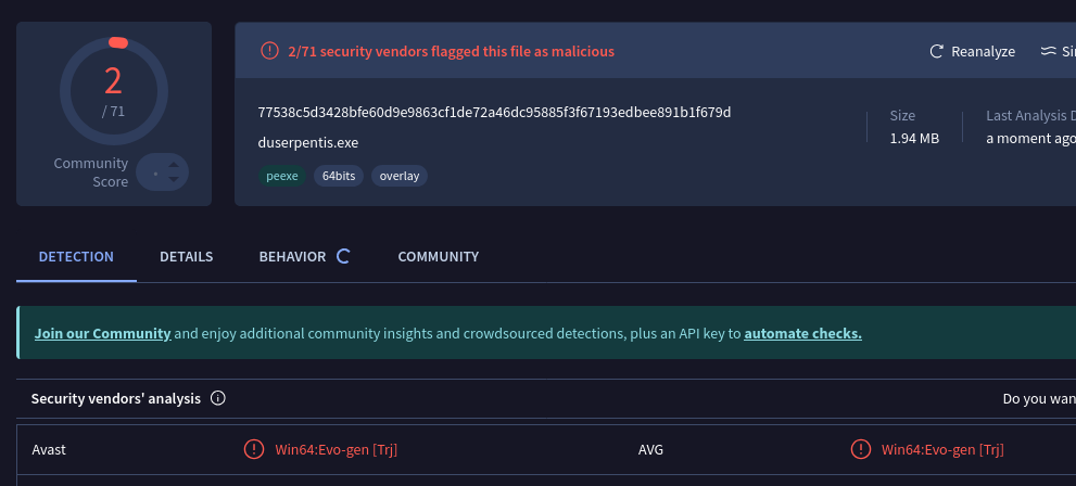 The game gets flagged as malicious by 2/71 in VirusTotal.