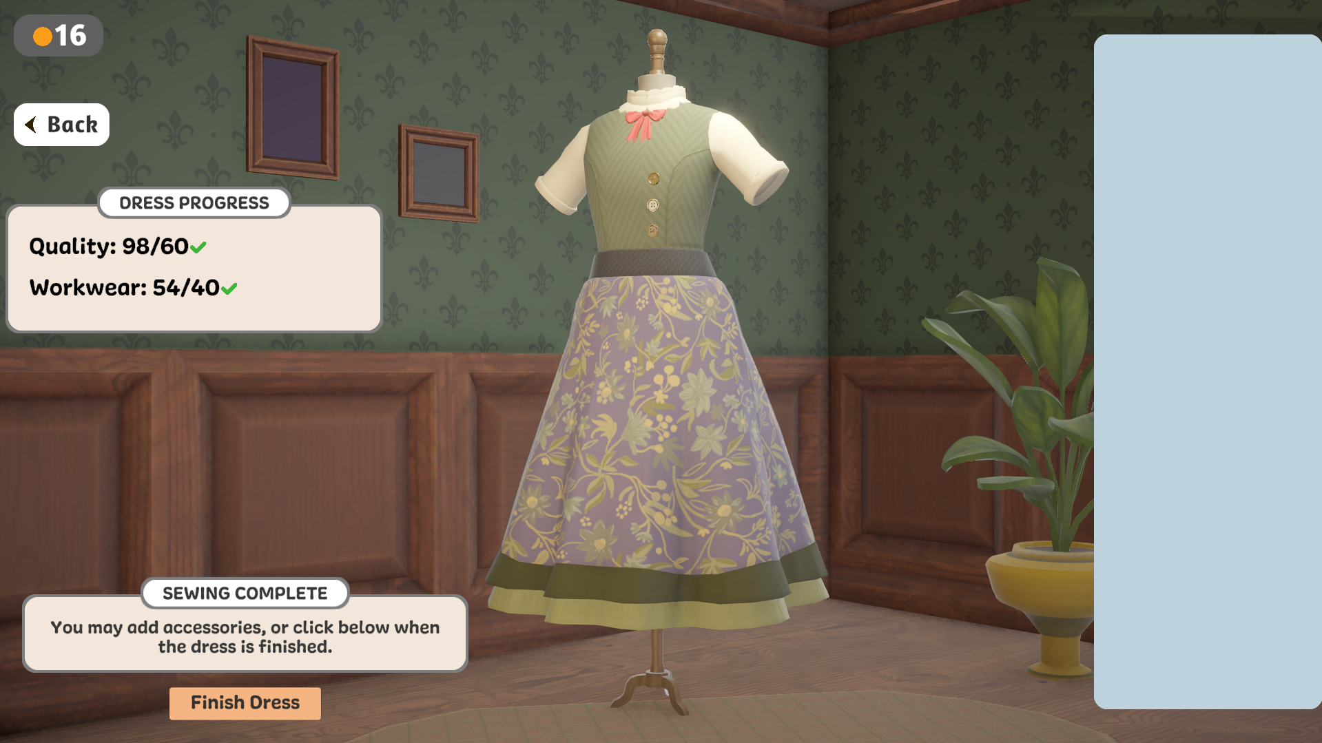 Otherwise regarding gameplay most things seemed really comfortable and easy to manipulate, but once I started sewing, I realized how badly I move my mouse, since I would unintentionally start sewing while also adjusting the fabric, which tented to be a bit frustrating.