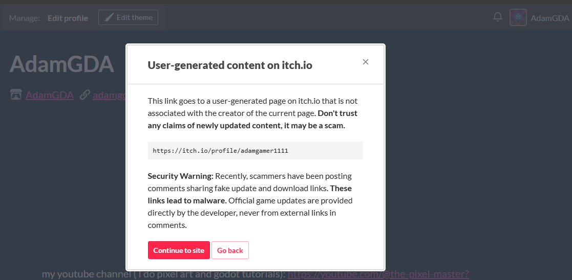I get a user generated content warning even though the link that leads there is mine , kinda weirdhttps://adamgamer1111.itch.io/ if u want to try it yourself