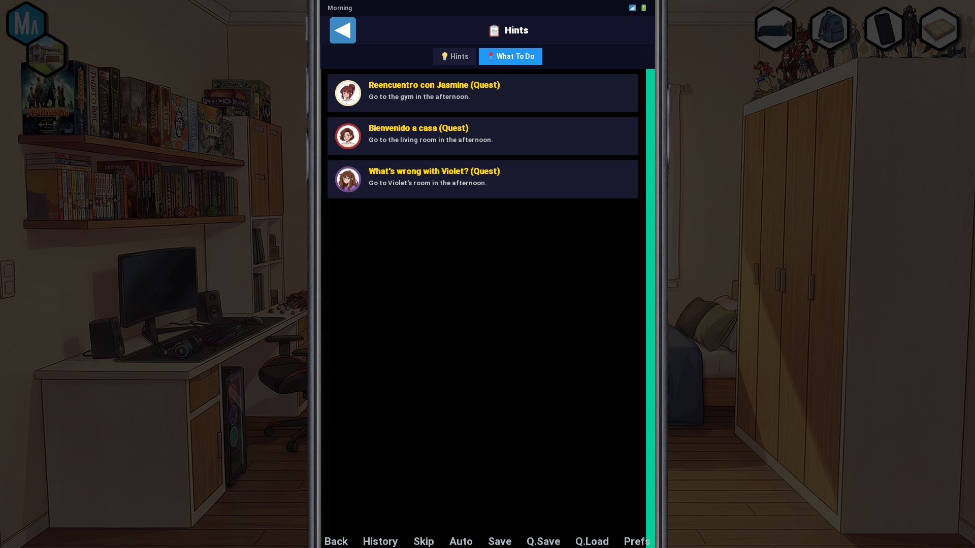 Regarding the second part, I also think I could add a short tutorial when you enter free mode to explain the features, and especially to show the hint menu where you can see how to progress with the quests (inside the phone, on the top right, there is an app where you can see what to do next).