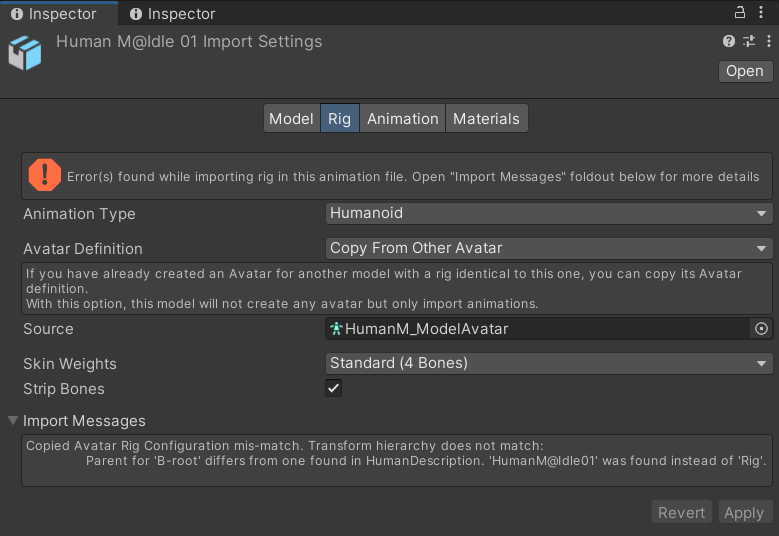 I'm setting up the rigs as Humanoid in unity 2022.3.25. First I can successfully generate the avatar for the male HumanM_Model. Then when I set Humanoid rigs for the male animations I get this error: Avatar Rig Conifguration miss-match. Transform hierarchy does not match (full details in the screenshot).