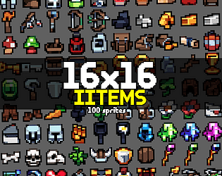 This pack includes 25 different sprites, 16 are 32x32 pixels and 9 are 64x32 pixels. Sprites are made in mind of grid-based inventories like in Diablo.