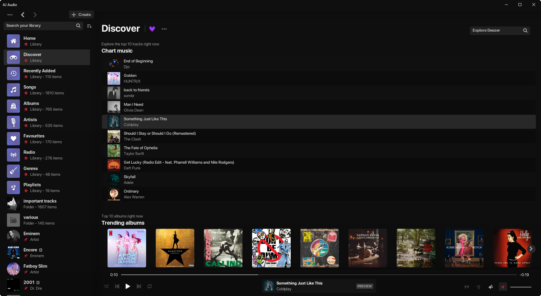 From v2.0.8 onward, AJ Audio comes with a new Discover page, where you can play music outside of your Jellyfin library via Deezer.