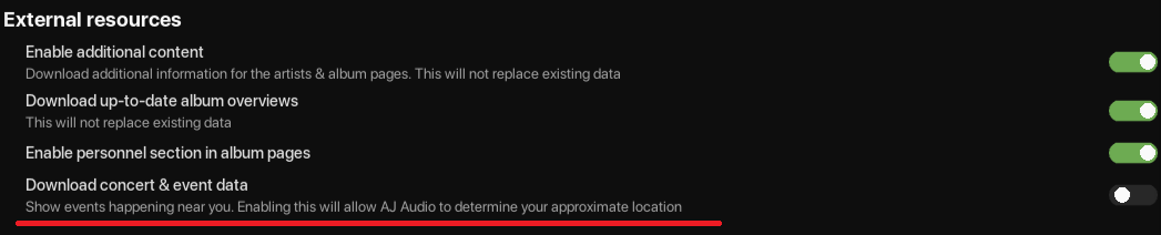 Events / upcoming concert data can be enabled under the "External Resources" section on the settings page: