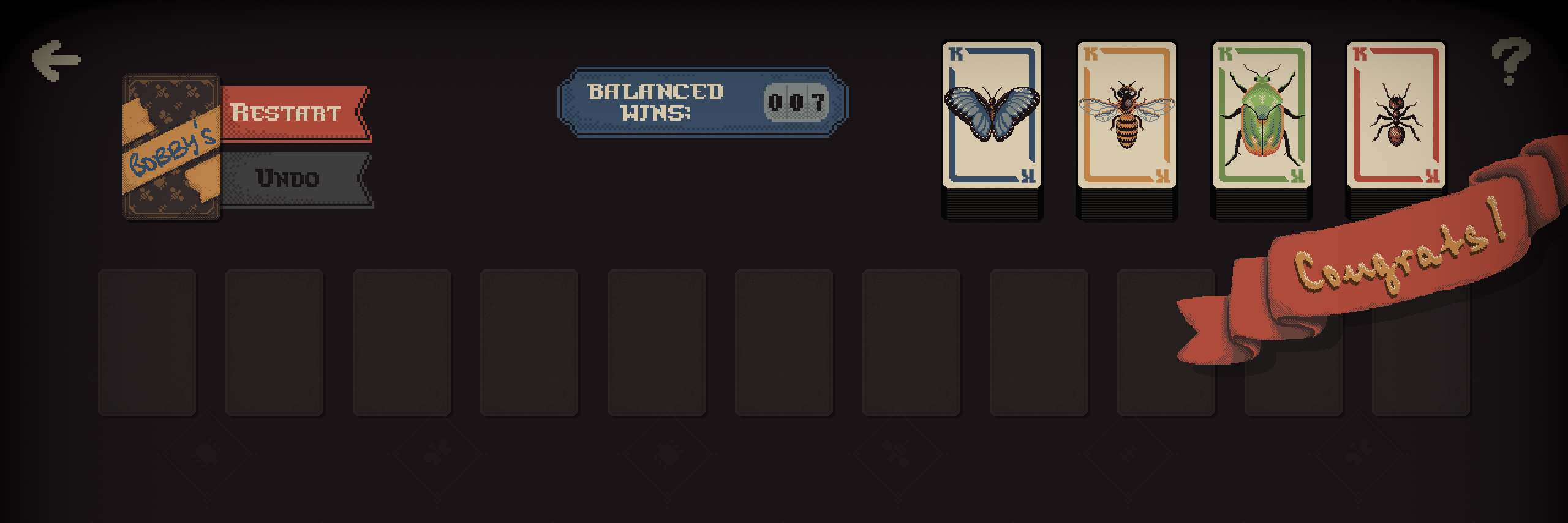 I think initially I expected to have the deck shuffle we see often in solitaire, the one that allows you to pull a new card when you gets stuck. But honestly after playing it a few times I think it's even more fun without that feature. It encourages you to try to figure out which move will give you the most progress. Would be nice to have a way to increase the difficulty, but regardless it was pretty fun. I like the start menu idea as well pretty out of the box or in the deck depending on how you want to see it. Well done! And the music is a jam as well! :D