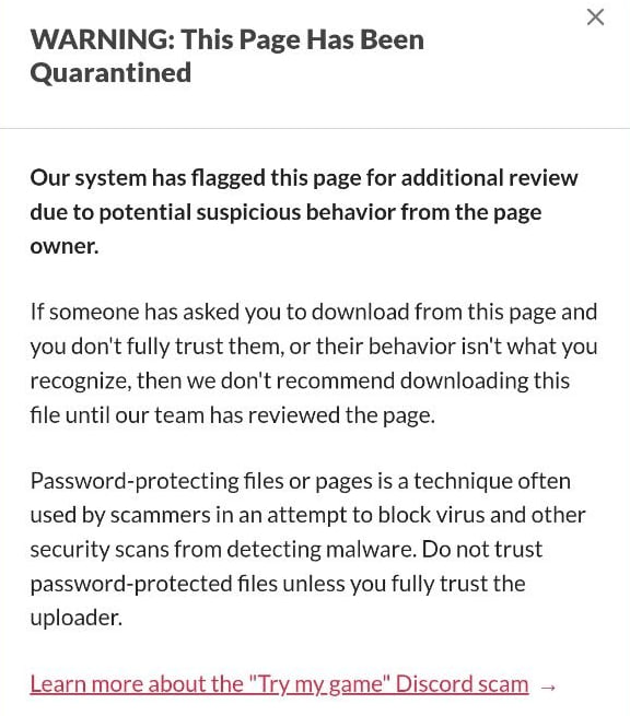 I also read that I can boost the support ticket's importance by getting more people to visit my game's page (not sure if this works if the mods already let the admins know about my ticket, but still). So I tried it, but the thing is, they get the following message: