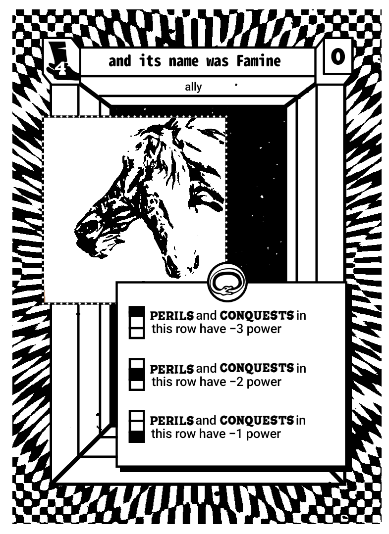 What captivates me about the cards here is how much isn't said. The black/white nature of the artstyle means there's little detail one can add without the art becoming incomprehensible. It's ideal for 1 subject and minimal to no backgrounds.