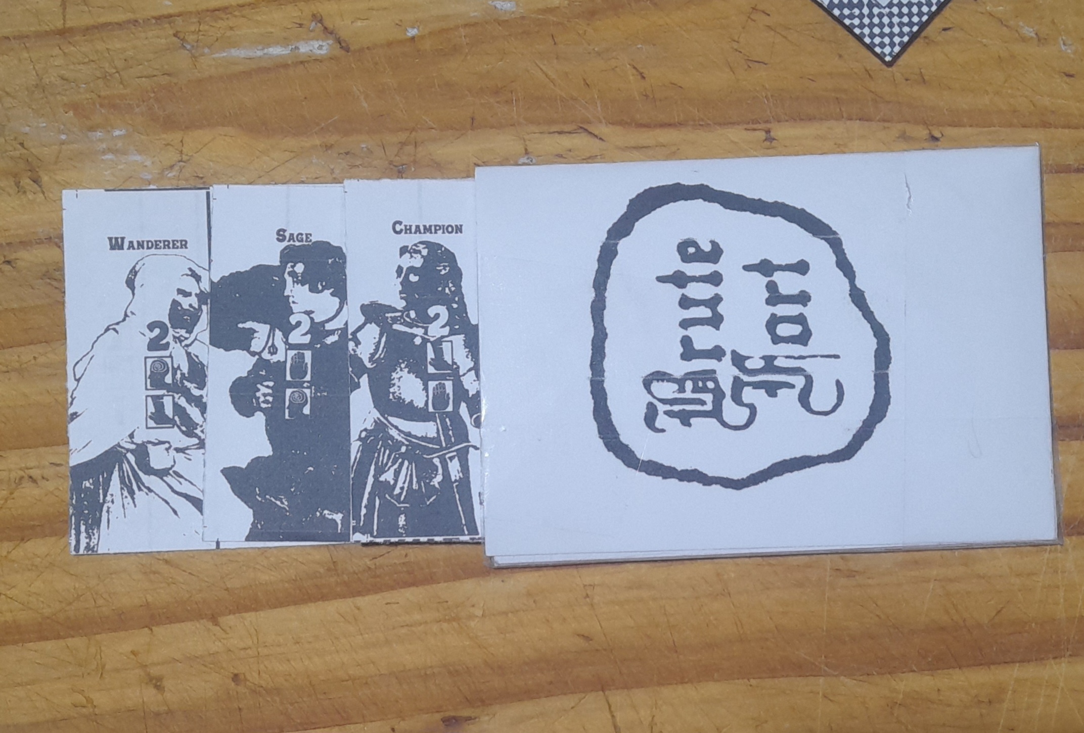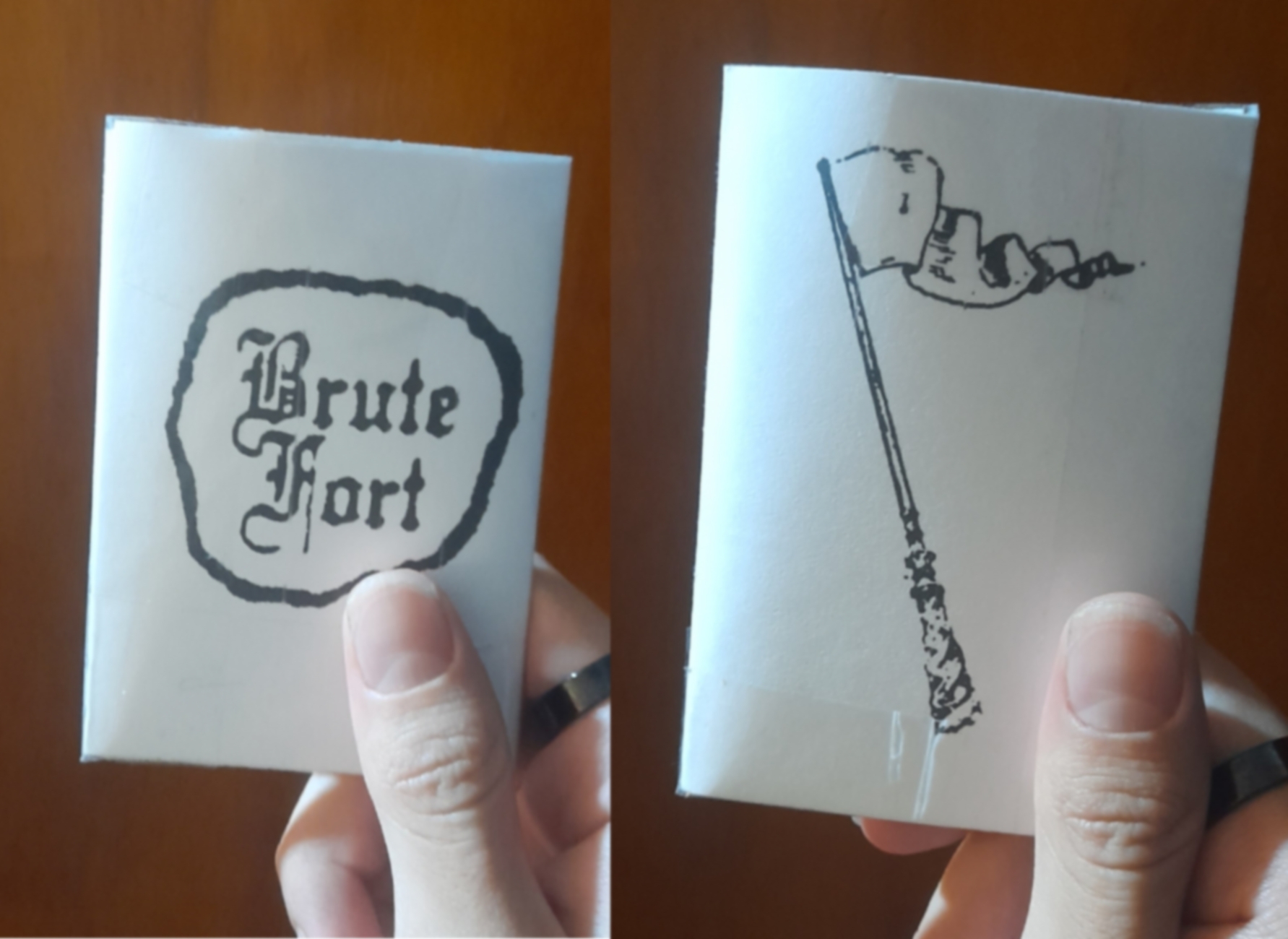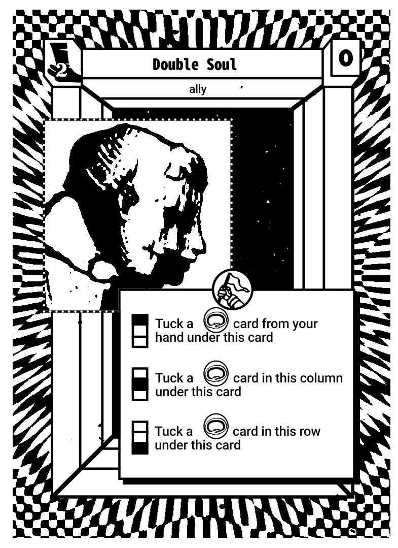 I saw a drawing of clergymen (?) standing close together in a public domain archive. It spoke to me about body doubling, possesions, exorcisms. Two souls in one body. And I felt a good analogue for Brute Fort was tucking. Two cards in one space.