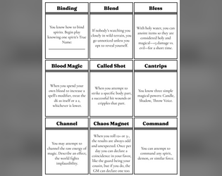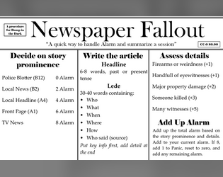 Finally it might be helpful to have a page of inspiration for things that can happen due to failure, like a pbta GM moves list, since a low prep high improv game can have a high cognitive load.