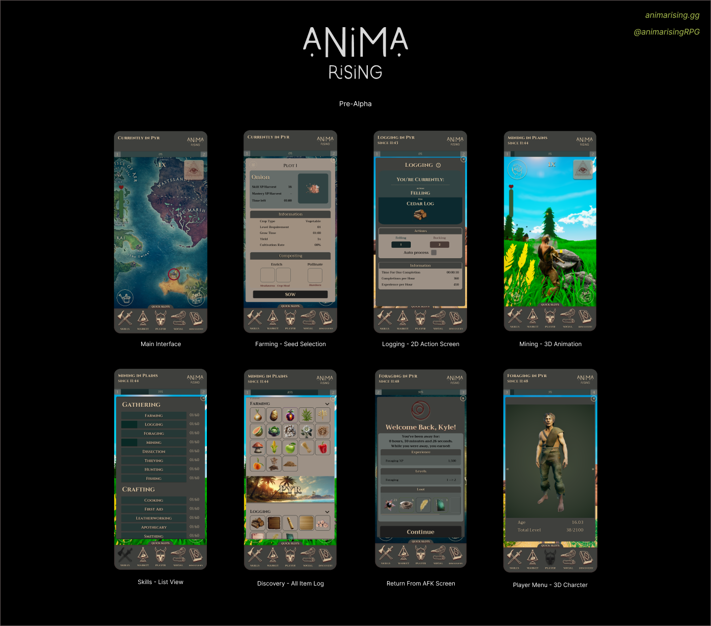 I've been working on my first game, ANiMA RiSiNG, for almost 2 years now. It's a 3D idle-sim MMORPG set on a parallel real-world timeline. Among other things, it features 35 open-ended skills & a multiyear dark fantasy storyline.