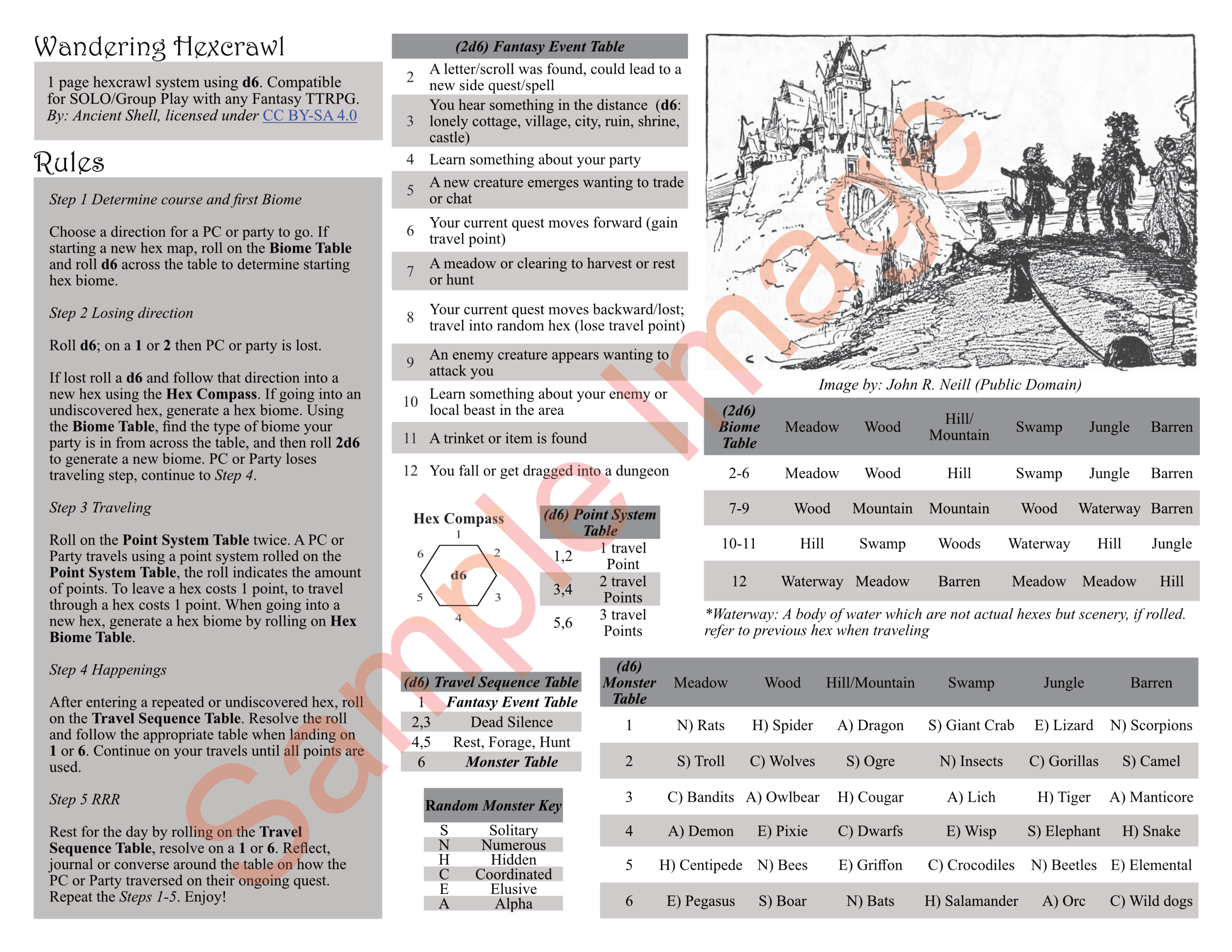 It is a 1-page Hexcrawl system that uses d6. There is a simple 5 steps process that also includes a monster table, event table, and biome table to get your adventure started!