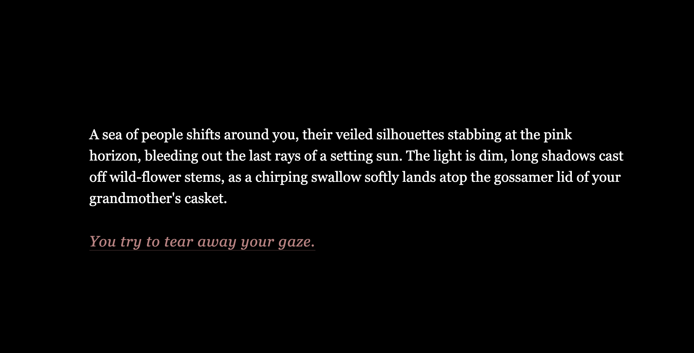 This is a relatively short (10/15-ish minute) long story focusing on grief and loss of culture, where the protagonist loses their grandmother, and finds themselves unable to translate her last words. Based on choices made, the story ends with a couple different translations of the grandmother's note, though the main focus is on the journey towards said translations.