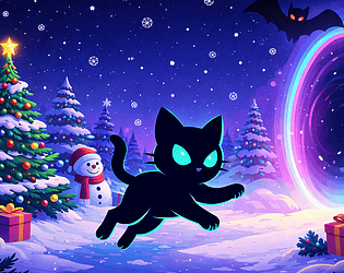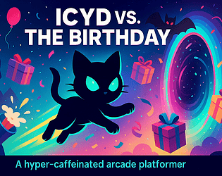 A hyper-caffeinated platformer where a black cat crash-tackles a birthday across neon skies, cake cannons & portals.