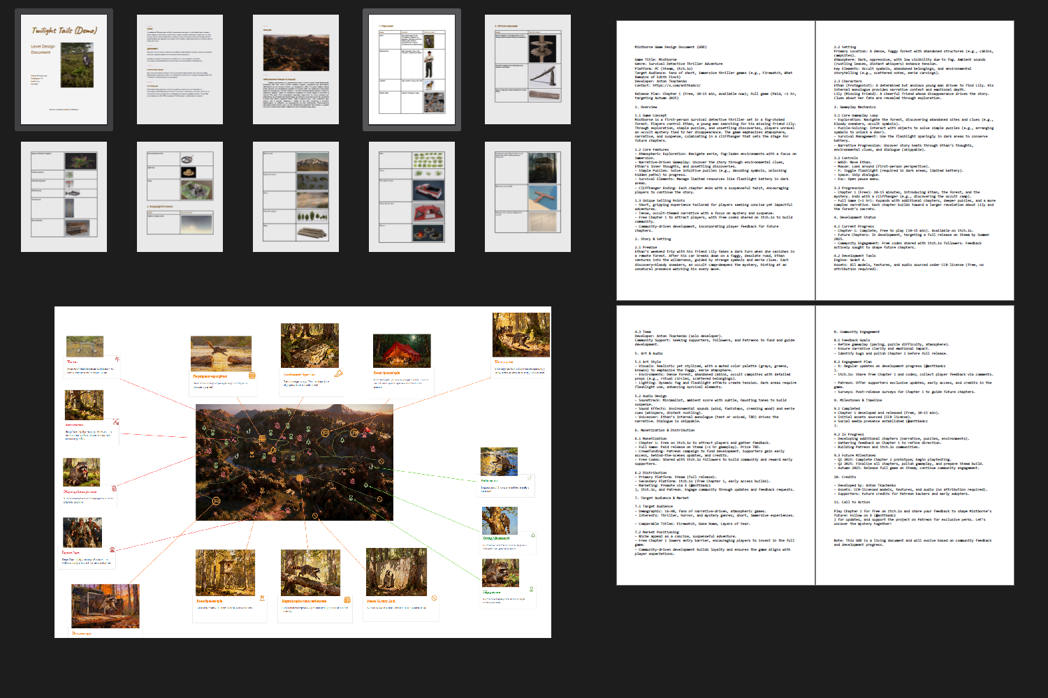 Low-res photo of some docs I've recently made. Such as Game Design Doc or Level Design Doc: