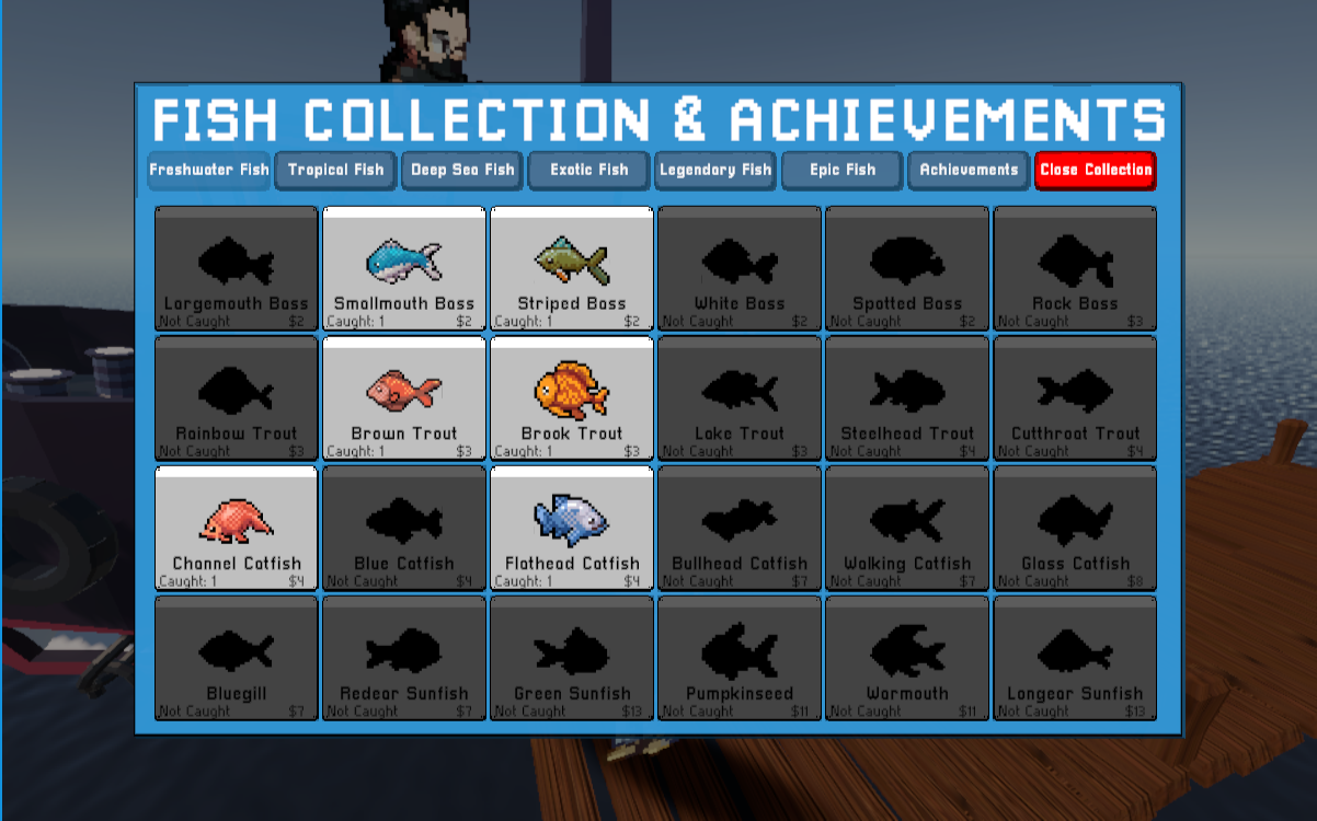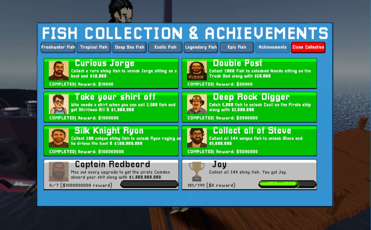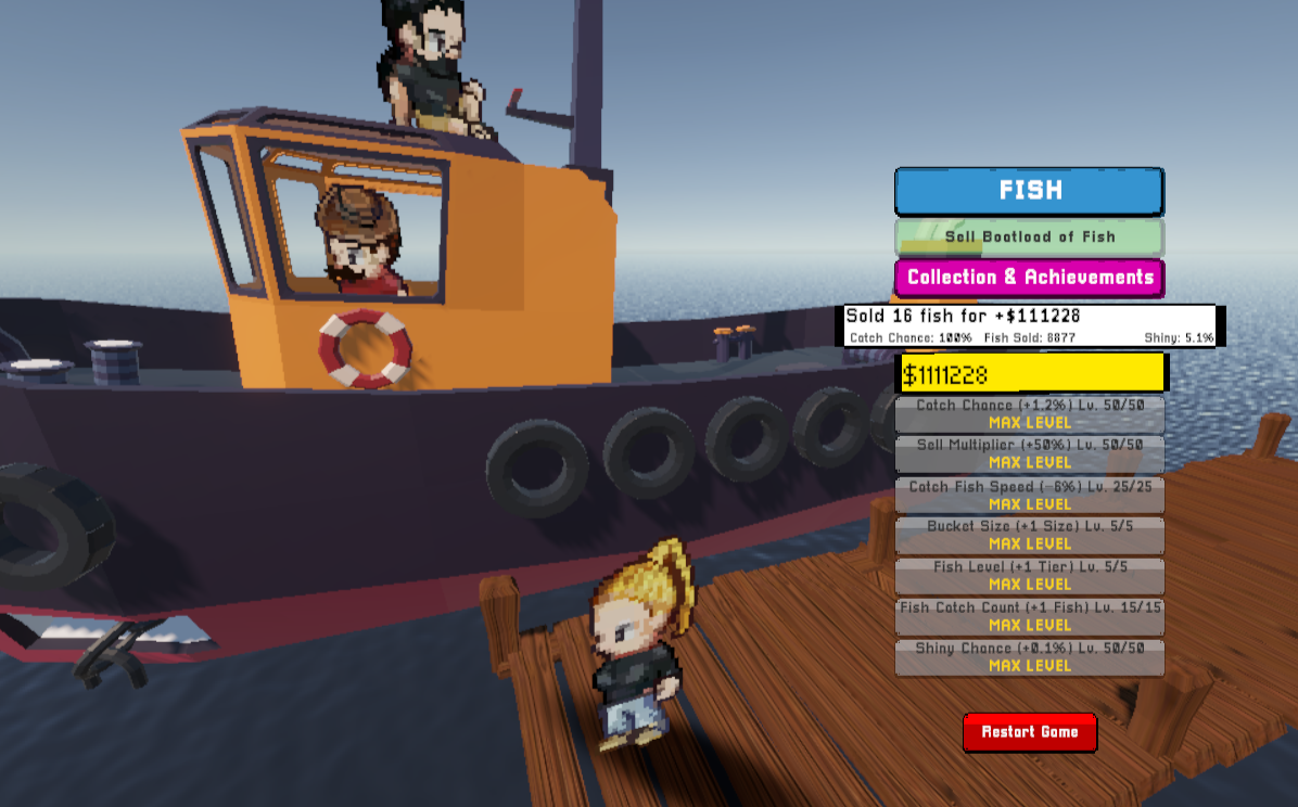 This was a ton of fun! I really enjoyed the soundtrack and gameplay! The art style was really cute and I had fun looking at each of the fish! I did notice that when I maxed all of the upgrades Captain Redbeard didn't unlock though. Also, when I refreshed the page, my unlocked/shiny fish reset. It was still a really fun game though!