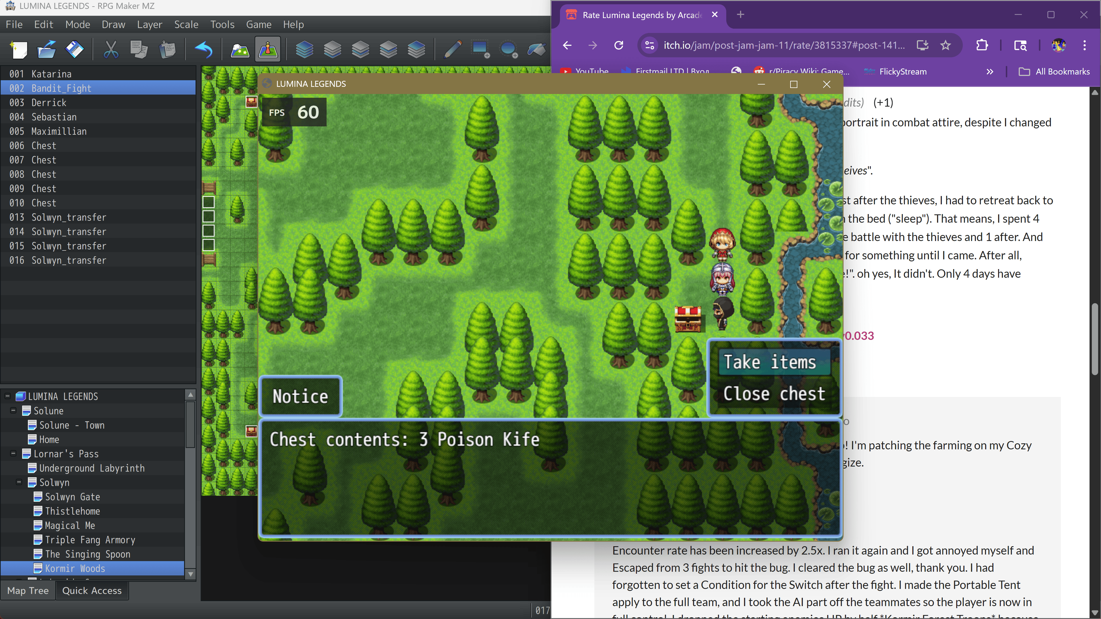 Encounter rate has been increased by 2.5x. I ran it again and I got annoyed myself and Escaped from 3 fights to hit the bug. I cleared the bug as well, thank you. I had forgotten to set a Condition for the Switch after the fight. I made the Portable Tent apply to the full team, and I took the AI part off the teammates so the player is now in full control. I dropped the starting enemies HP by half *Kormir Forest Troops* because I agree, it was a slog for a starter area. Good eye on catching the "ei" instead of "ie"! I'm triple checking further and then i'll reupload the updated version. I'll need to work on the game recognizing which Actor_Image is being used so it can always call it properly in Text.
