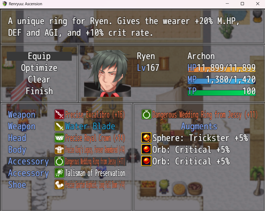 I also Use the Trickster Sphere in Ryen´s Ring so i can have TP regen and his good wedding ring. I also use crit orbs in every slot possible to get as as close to 100% as possible (Elly can reach 100% very easy i use protection 5% or AGI here instead) crits do like 300% damage in this game and are very strong.