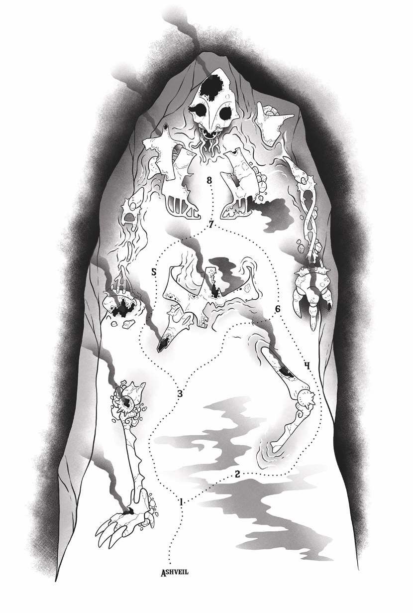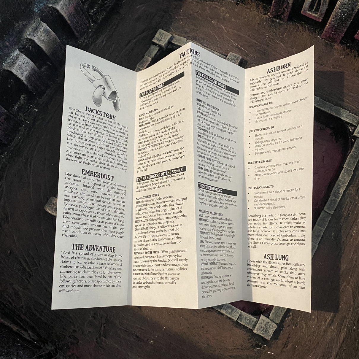 This adventure comes with four rival factions with their own reasons for acquiring the treasure for themselves. A map of the ruins showing the possible routes the party can take, as well as the events they can run into. While the adventure is system agnostic, it does have light rules for what happens when a player consumes Emberdust or breath too much of the smoke that eternally billows off surrounding ruins.