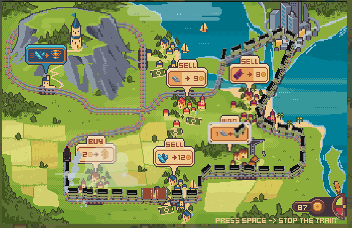 There are two bugs worth of notice: the first one is that the house sprite where you sell the 3 crystals for the win, shows on top of the train; The other is that if I press rapidly on the cities' buttons I manage to buy/sell more than one time.