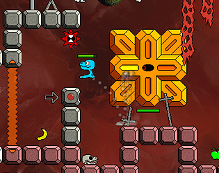 About death and respawn, I will stick to this simple principle in the whole game : Hop is always sent back to the last place where he hit the ground before dying. I know how some games can be frustrating when you have to restart from scratch after almost completing a level. That's why every boss of Hop! 2D remains wounded when the player restarts a level after loosing a life against him. This way, the game gets easier and more rewarding for casual players.