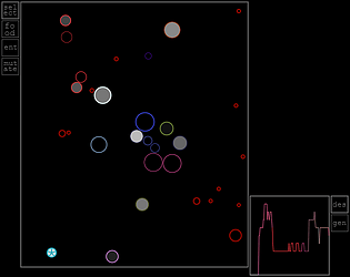The traits also have sub-traits which are multipliers affecting how the trait responds to changes in the environment. For example, the nurture trait has multipliers for current integrity, current energy, abundance (how much food is nearby) and crowdedness (how many organellos are nearby). The multipliers also differ from organello to organello and mutate with reproduction, making some more willing to reproduce while more entities are nearby and some less, some just move slowly and try to collect nearby food when they’re low on energy but move further when they have more energy, and so on