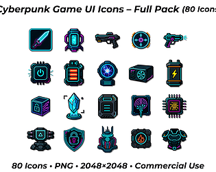 80 High-quality neon cyberpunk icons for games and apps (2048x2048, PNG).