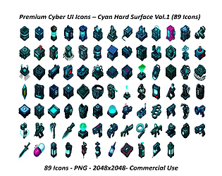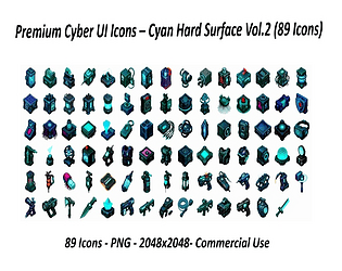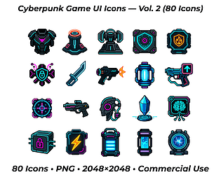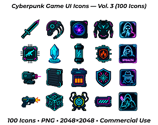 100 high-quality cyberpunk-themed UI icons for futuristic games and apps. 4096x4096px, PNG