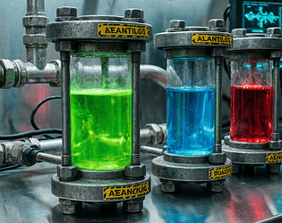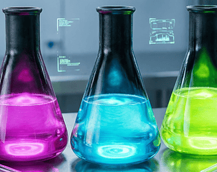 11 clean lab-style conical flasks with vibrant chemical liquids — perfect for sci-fi RPGs