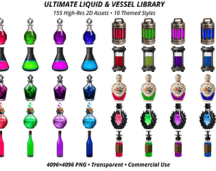 155 high-res potion bottles for RPG inventory & UI. 4096×4096 PNG, transparent. Two ZIP files.