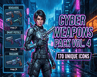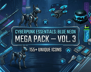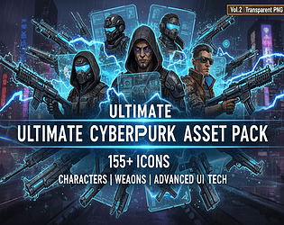 155 cyberpunk icons - weapons, tech, UI elements & characters. Perfect for game devs!