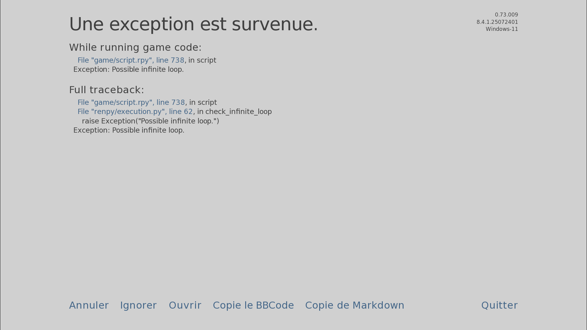 j'ai un bug quand je vais dormir le jeu me dit qu'il y a une erreur avec une "infinity loop" si vous avez un moyens de résoudre se problème je veux bien de l'aide.