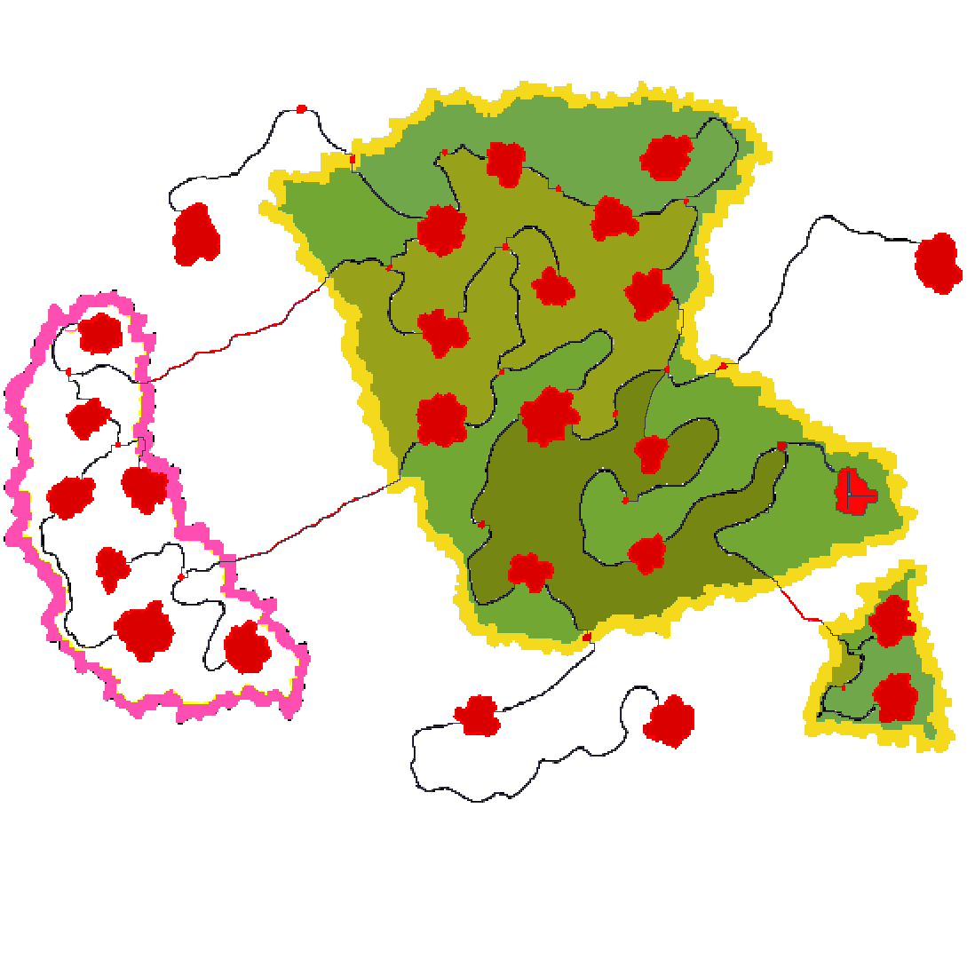 The current state of the game map. The red things are the major cities / POI of the game. However, there will be minor towns all around the map.