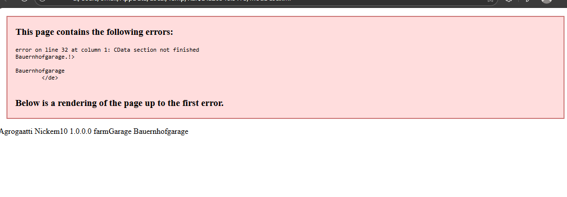 error on line 32 at column 1: CData section not finished Bauernhofgarage.!> Bauernhofgarage </de>'