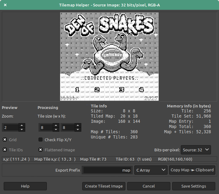 I noticed a glitchy issue when importing the title screen graphic from Den of Snakes (with gb studio limits turned off in a new project). After importing a second time the image was ok.