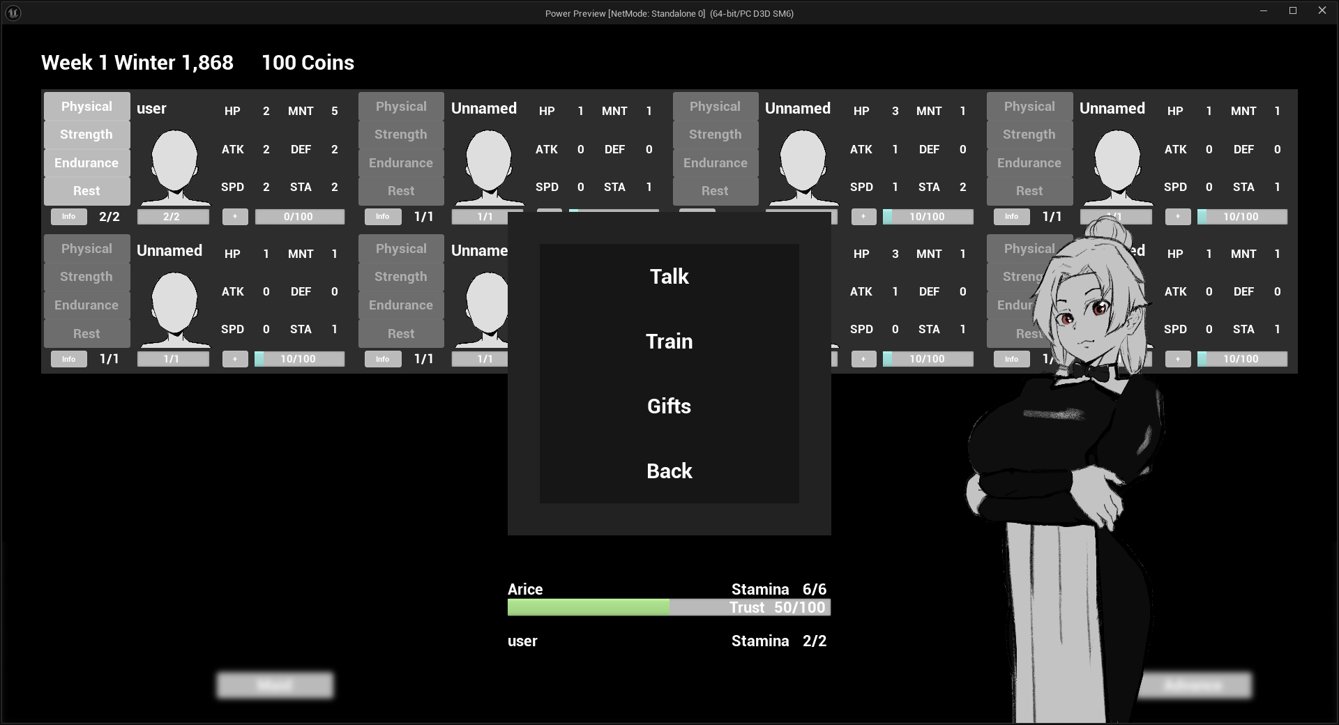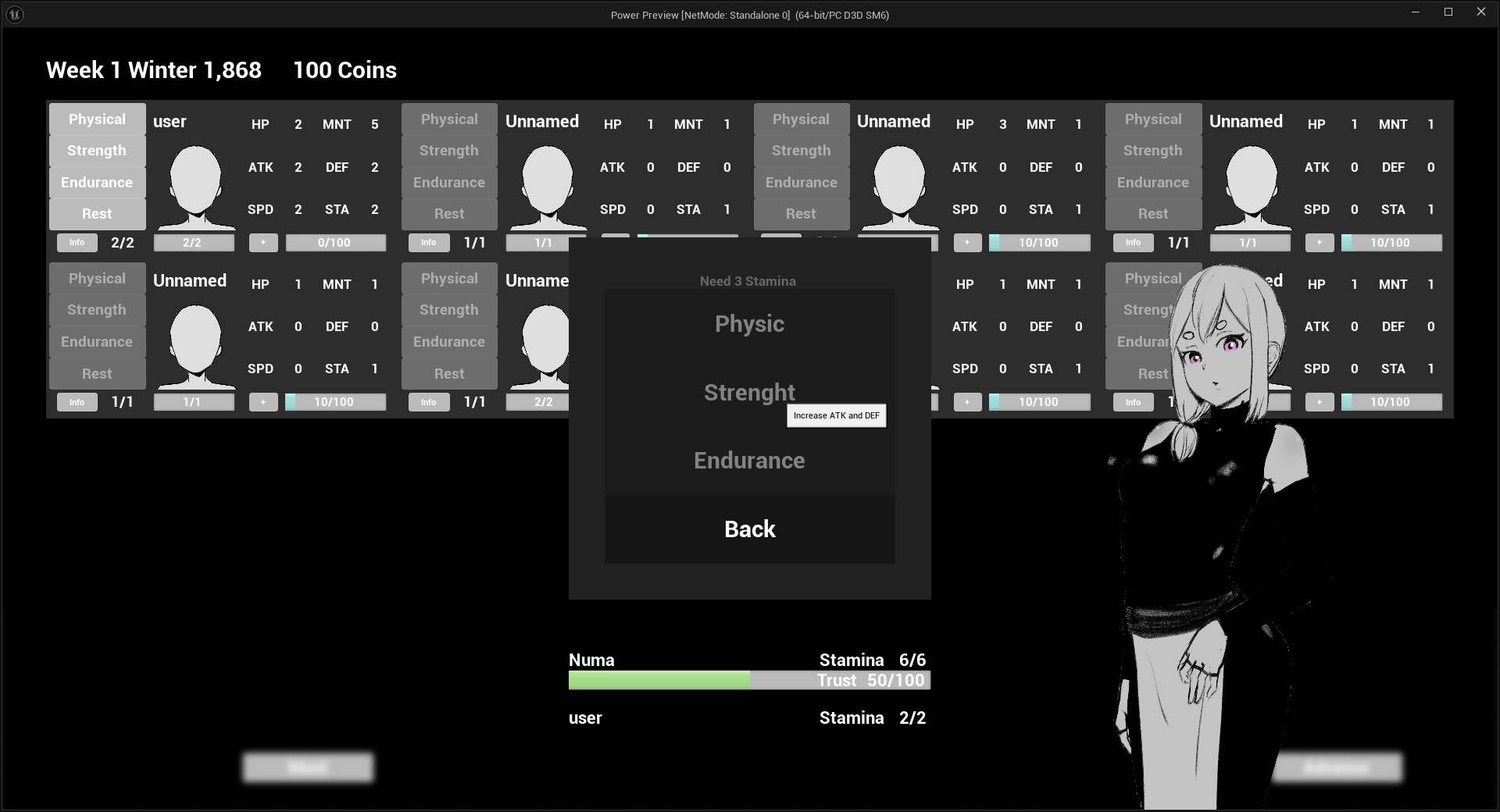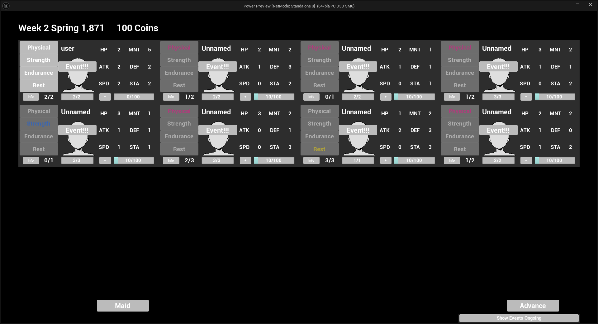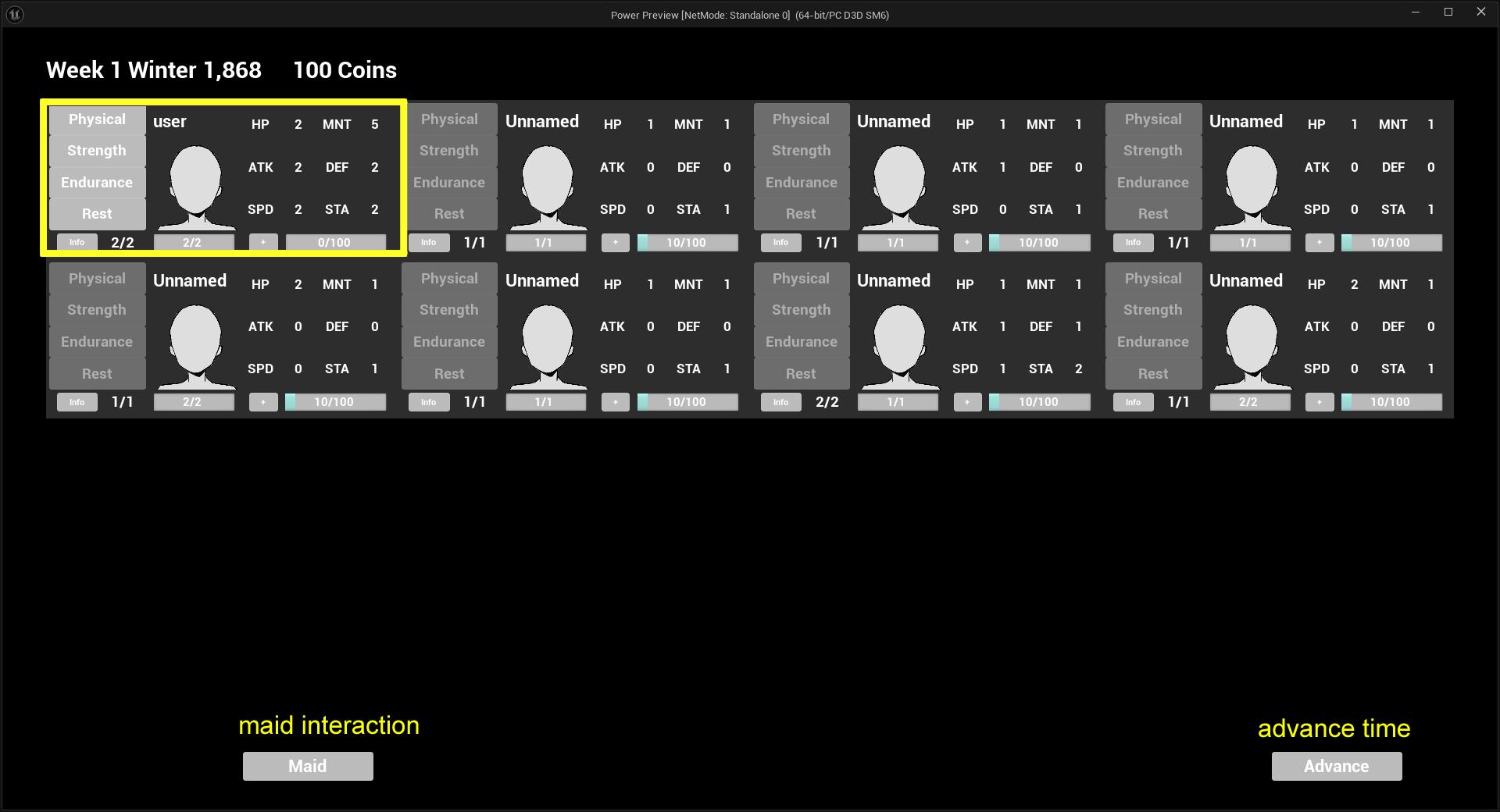 You are the one in the yellow square, you can choose between physical. strength, endurance or rest , the first 3 are training activities, the last one is to recover stamina, you can also train without stamina but you HP will decrease. Choose an option and them advance time.