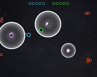 The basic mechanic of this game is that the player shoots "black holes" at the opposing player. trying to get the other player stuck and lose a life. The black holes merge together when they hit each other, creating large black holes. The larger the hole is, the more attraction force it will have. The orange obstacles are bouncy obstacles that can send players off into unwanted directions, or they might just save them from a couple close calls too.