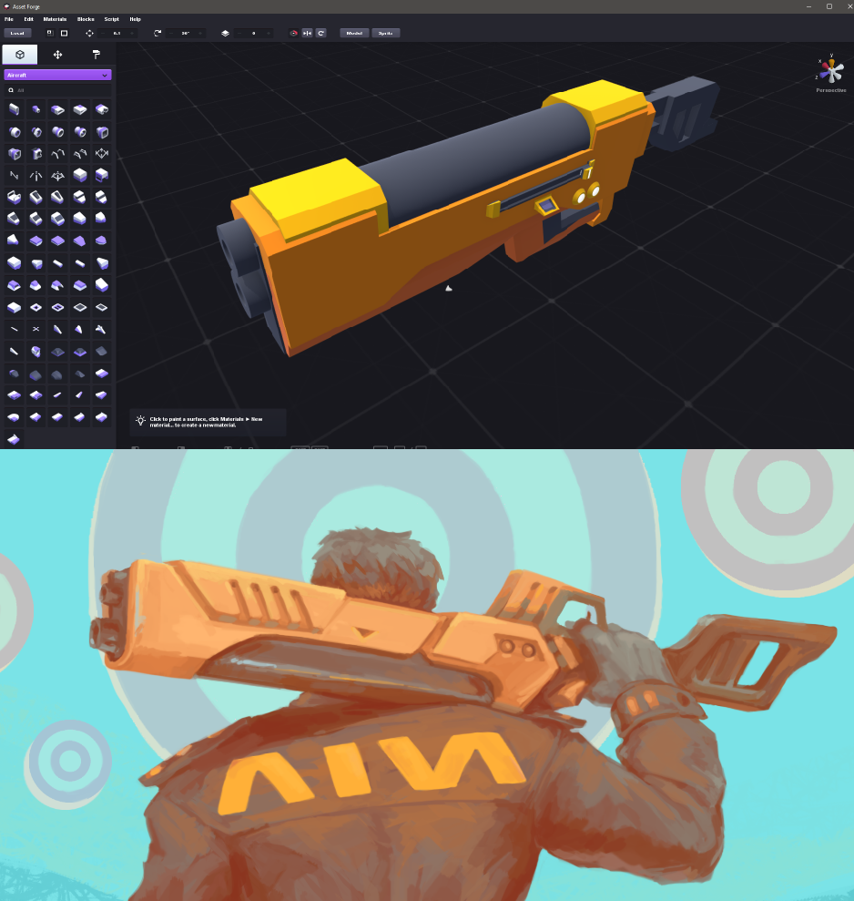 In the meantime I've decided to play a bit with Asset Forge, and try to recreate gun from the capule image. I'll use it as a diegetic UI for mouse sensitivity and maybe few more things, we'll see how that will go.