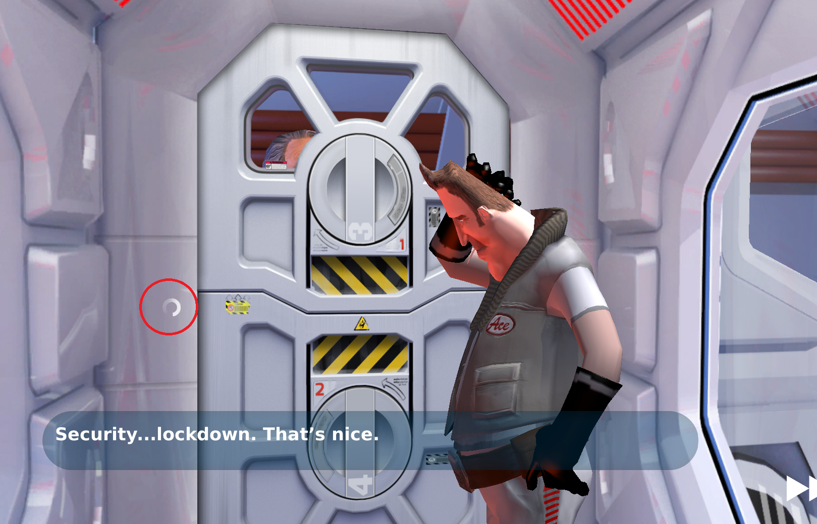 Finally, and this might be more a matter of opinion, but the first time you have control in the game, you can't do anything with the airlock as it doesn't have a hotspot - you have to walk towards it, which doesn't make much sense given how close to it you are to begin with. Would it not make more sense to have the airlock as a standard hotspot, and when you "use" it, Ace walks towards it and you get the closer view or at least comment he needs to be closer?