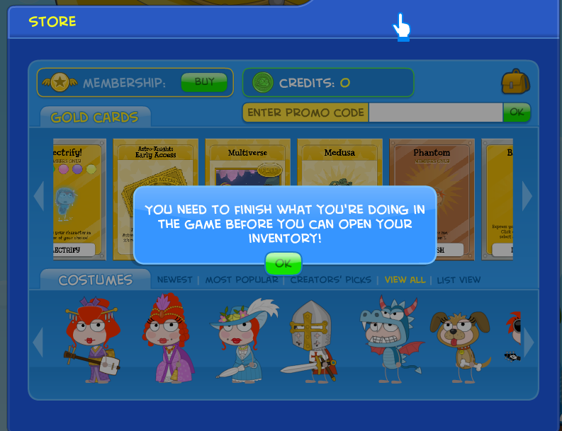 Firts of all thank you for the game and making everything in the store 0 credits. I was always wondering what some of these things do. But when I try to buy something I get this notification. I'm horible at computers did I do something wrong? btw I'm not doing anything in the game just standing.