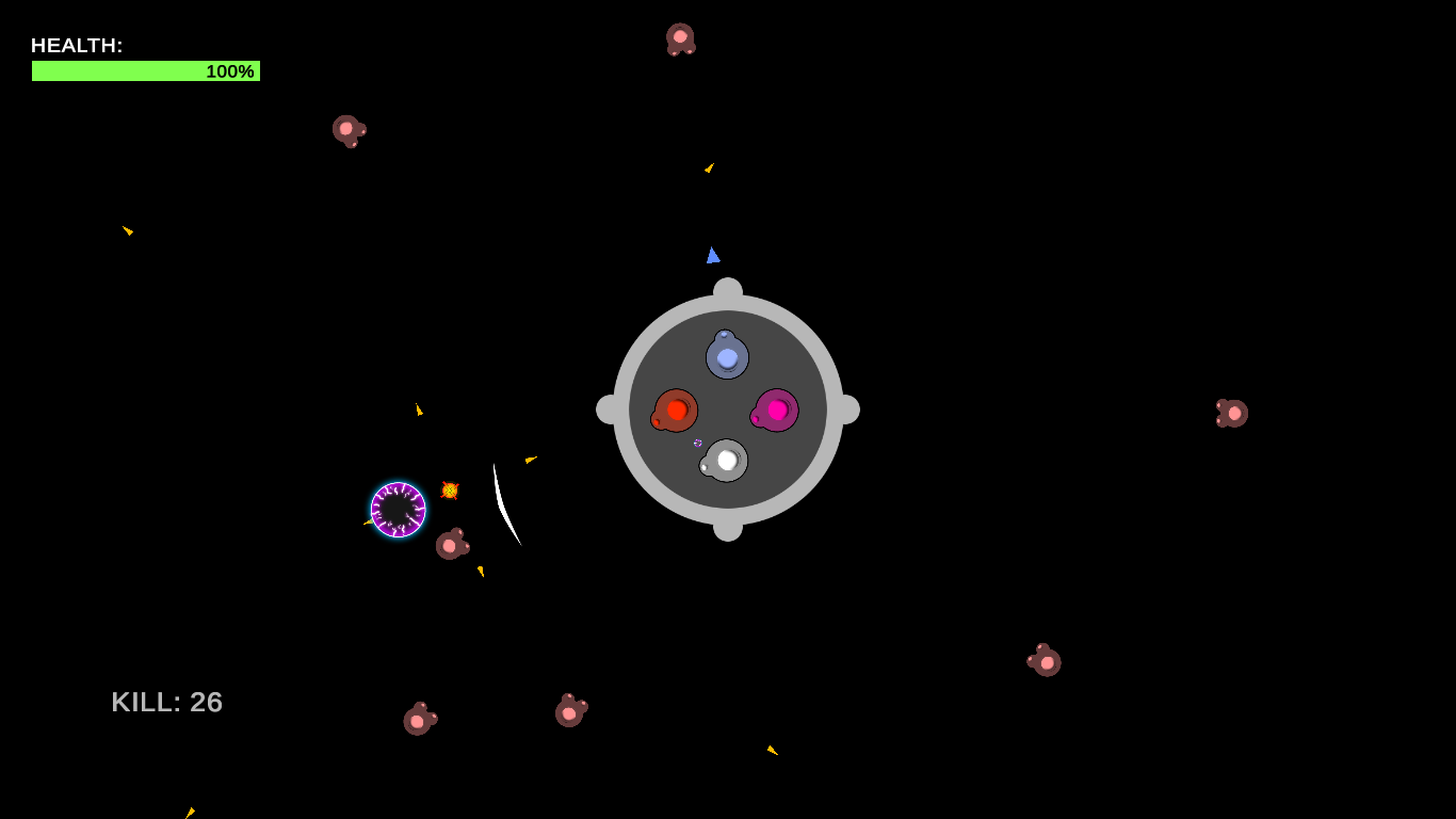 I remake an classic old snake game with a hunter (called killer) mode. The snake is not alone but there is an enemy called killer who shoot the snake and takes damages.