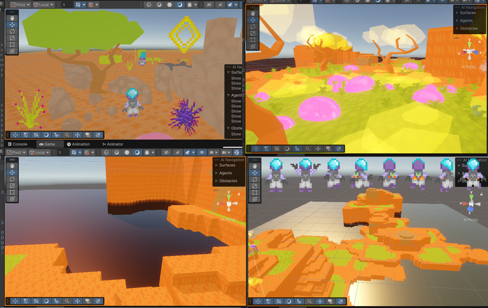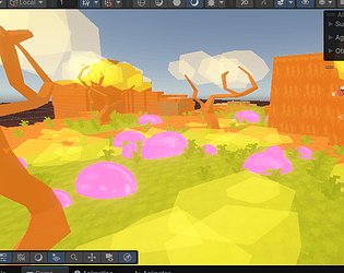 I was creating an alien world, but my programmer left the project without even telling me. When I found out it was already too late to make any gameplay for it. I did try to make it playable somehow, but it didn't work out, and I would've needed that time to finish the art and design part, so now I've got nothing. The goal would've been to find some ore to be able to launch off the planet with your starship, but it wouldn't have been as straight forward as you might expect. Here are a few screenshots I made along the process: