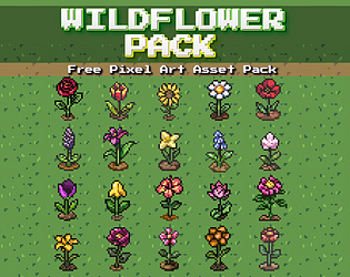 A free pack of colorful pixel art wildflowers for RPG and farming games.