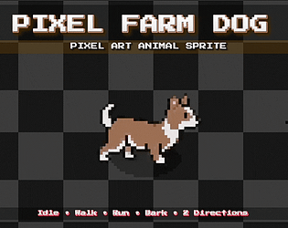 A 64×64 pixel farm dog sprite sheet with idle, walking, and barking animations