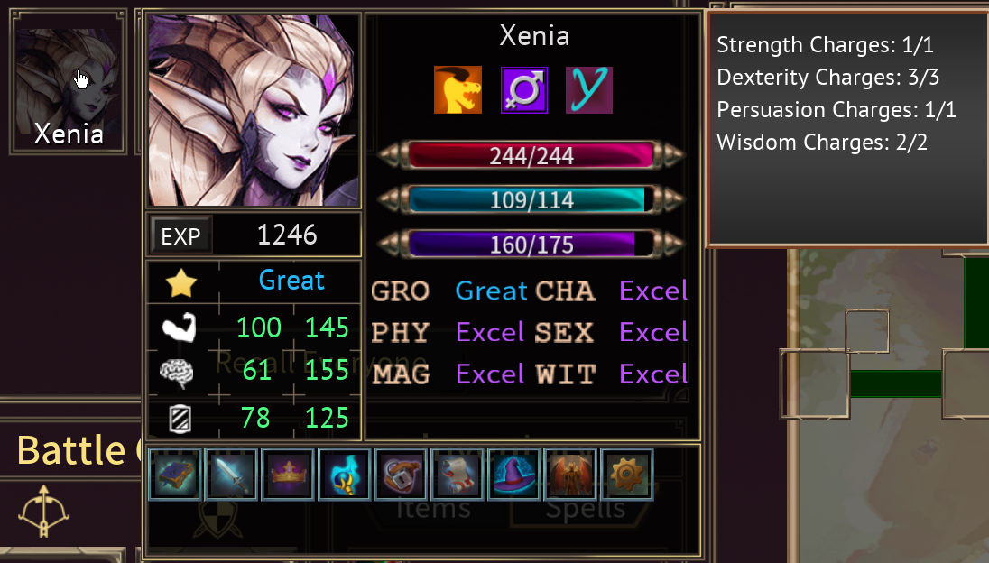 The full card after recharge. I realized I was providing less information because I assumed it wasn't relevant, but that's kinda shit practice for bug finding. It's probably not due to how much shit she has? But, hey, here's Xenia.