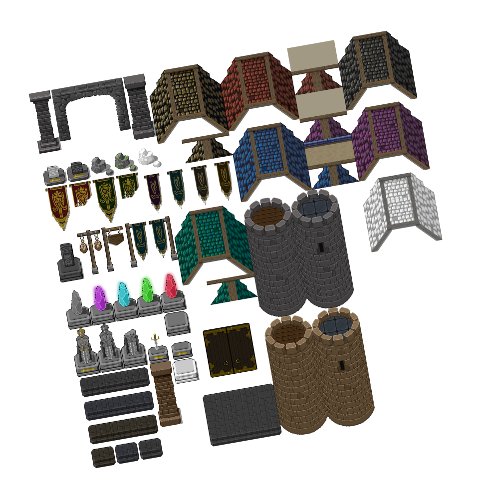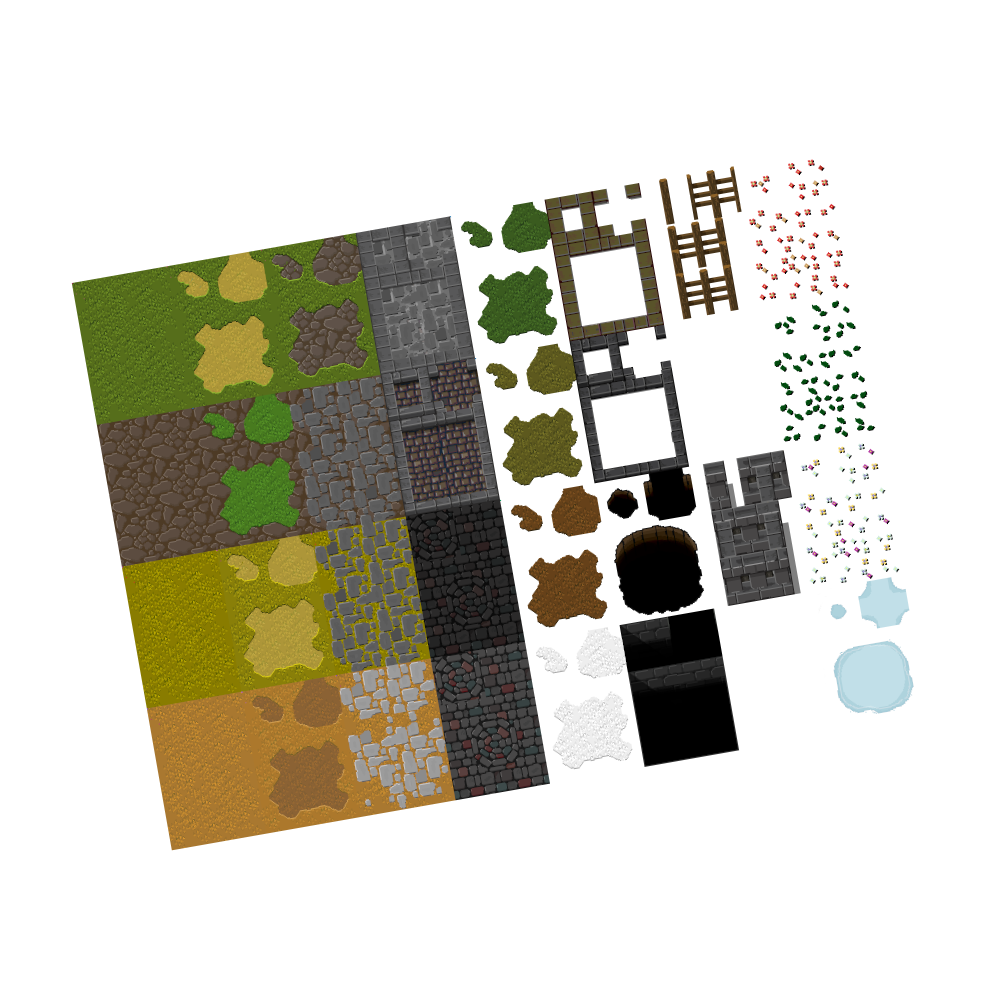This pack combines the Medieval Inside Tileset with 4 expansions DLC, giving you everything you need to create forests, citys, villages, castles and exterior scenes with a consistent style.