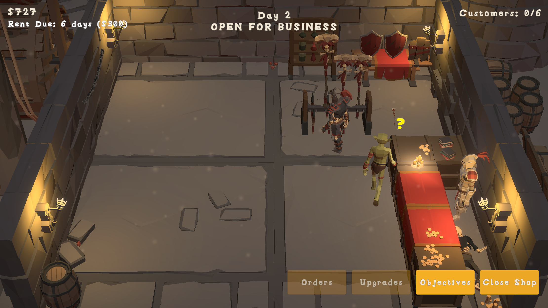 Recettear comparison: Great reference! I need to add more interesting sourcing beyond just bulk ordering. I also had an idea to have a second room, where you manage a small army of minions that go raid dungeons and places for you. But again, scope and time made it difficult to make … :D