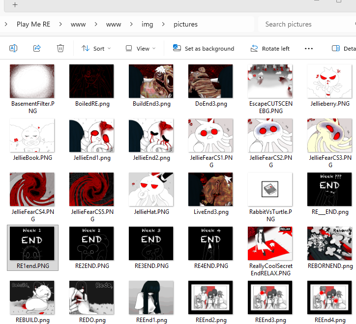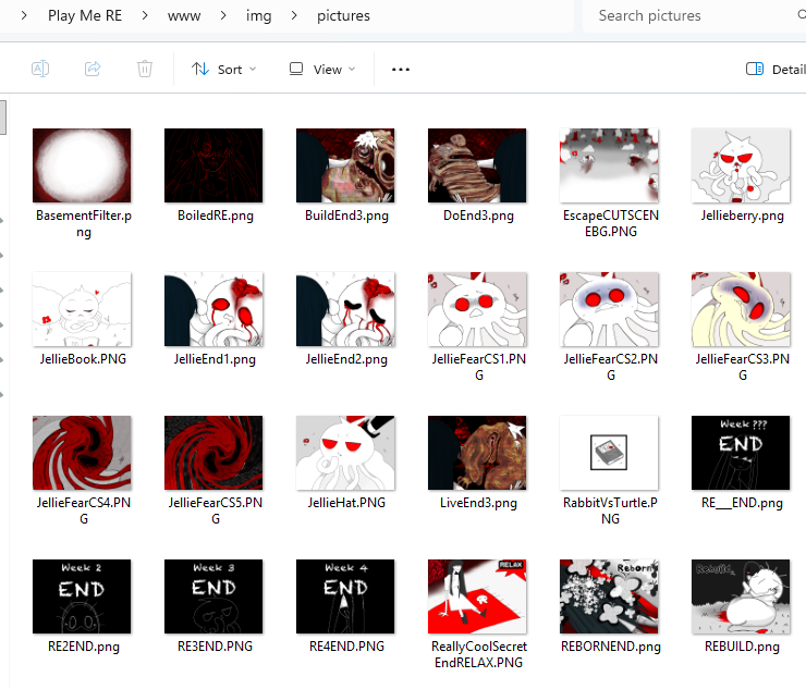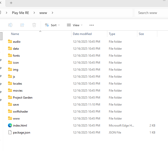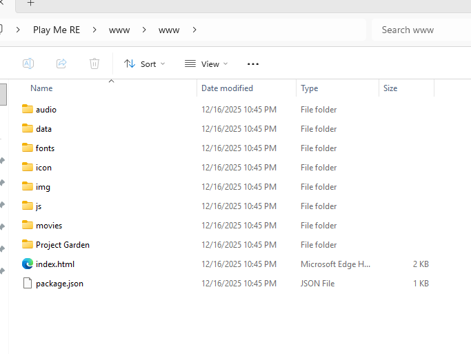 First image has the 1st file, second image is when I click on said www file, 3rd image is when I click on the 2nd www file. (4th and 5th images show the differences between the www files, including differences in the "Jellieberry.png" image, strangely the 2nd www has a "rough draft" version?) The game is clearly working with ONLY the "first www files" because there's a "save" folder there, with my save data, yet the "first files" don't have the images that the game wants, while the "second www" does.
